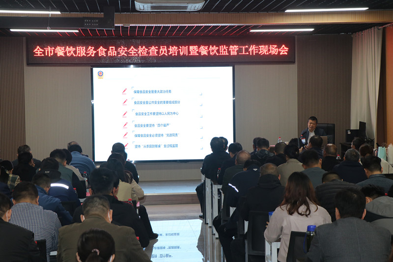 為進(jìn)一步豐富餐飲服務(wù)食品安全檢查員業(yè)務(wù)知識,提升全市餐飲環(huán)節(jié)食品安全監(jiān)管水平,棗莊市市場監(jiān)督管理局根據(jù)2023年餐飲監(jiān)管工作計劃,于11月8日,在臺兒莊古城學(xué)校召開全市餐飲監(jiān)管工作暨餐飲服務(wù)食品安全檢查員培訓(xùn)會議,市、區(qū)兩級局分管局長、餐飲科全體人員、全市餐飲服務(wù)食品安全檢查員參加。會議由市市場監(jiān)管局副局長張衍耀主持;臺兒莊區(qū)委常委、副區(qū)長孫作偉致辭,并介紹建設(shè)“食安臺兒莊”的經(jīng)驗(yàn)和做法;山東省市場監(jiān)管局餐飲處一級調(diào)研員遲玉聚博士,作《深刻學(xué)習(xí)領(lǐng)會習(xí)近平總書記重要論述精神努力守住食品安全底線》主題報告。