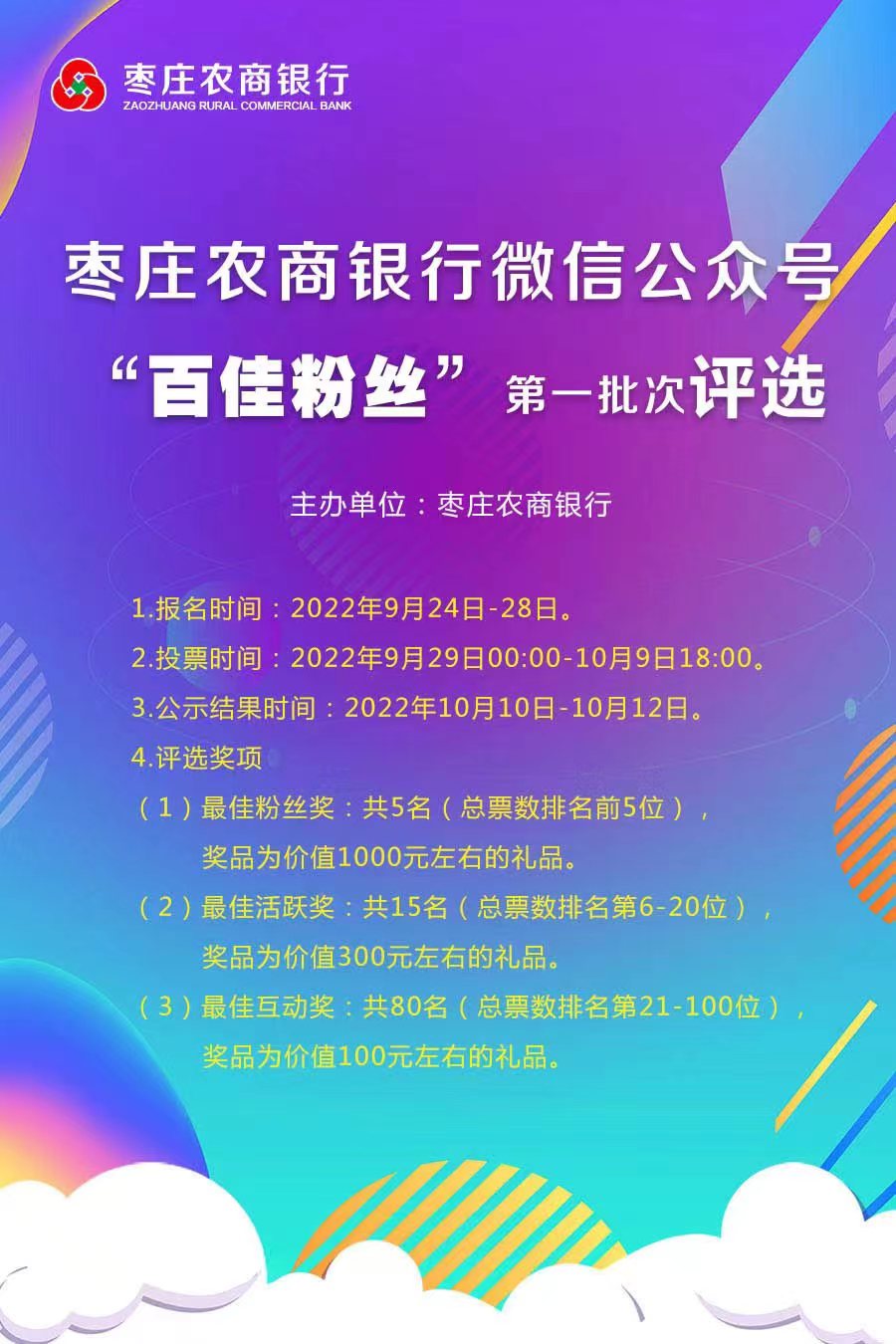為強(qiáng)化線(xiàn)上自媒體宣傳,加大微信公眾號(hào)推廣力度,棗莊農(nóng)商銀行開(kāi)展“百佳粉絲”第一批次評(píng)選活動(dòng),回饋廣大公眾號(hào)粉絲的熱切關(guān)注,感謝廣大客戶(hù)長(zhǎng)期以來(lái)對(duì)棗莊農(nóng)商銀行的關(guān)心與支持。最終評(píng)選出的粉絲可獲贈(zèng)神秘大禮一份,同時(shí)對(duì)所有關(guān)注公眾號(hào)并參加了投票的粉絲均可參與抽獎(jiǎng)活動(dòng),更有機(jī)會(huì)獲得精美禮品一份。